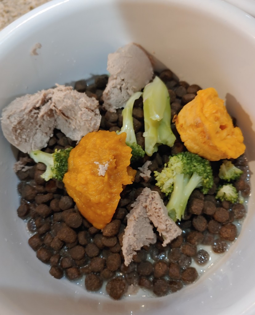 今までもドライドッグフードにゆでたブロッコリー、パンプキンペースト、茹でた鶏肉、肉の煮汁を混ぜてあげていたが、徐々にドッグフードを減らし、ご飯に変えていくことにする。