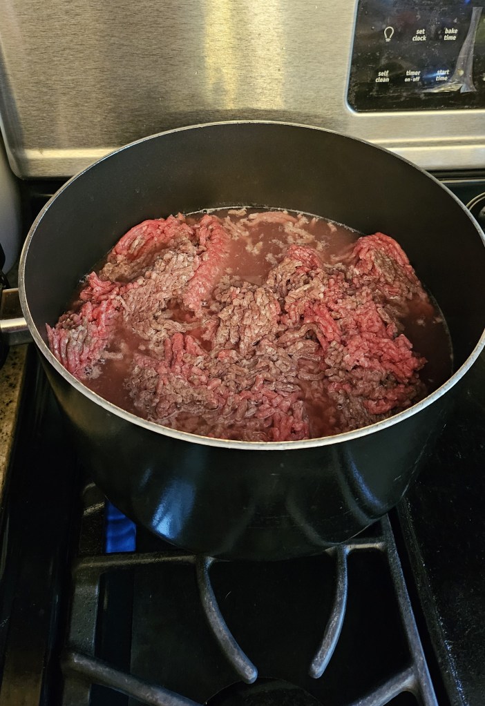 1. 牛ひき肉に肉がかぶるくらいの水を入れ、煮る(?)。