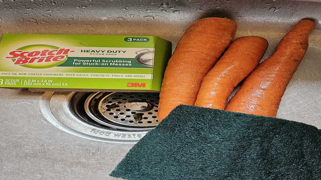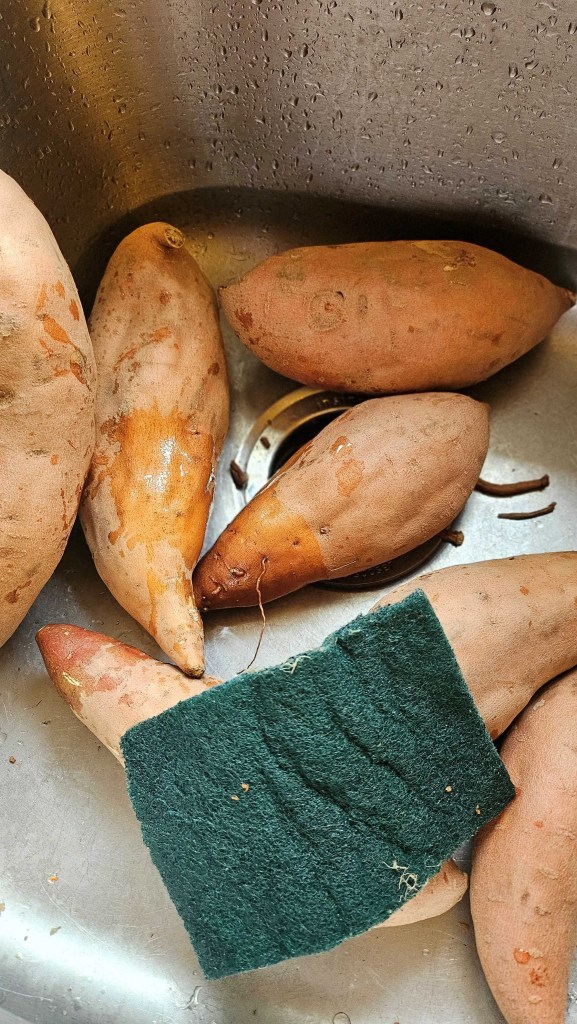 2. 野菜を洗う。今まではブラシを使っていたけど、Scrab Padの方が早く、そして簡単に綺麗になるのでScrab Padでニンジン、Sweet Potatoはゴシゴシ。
