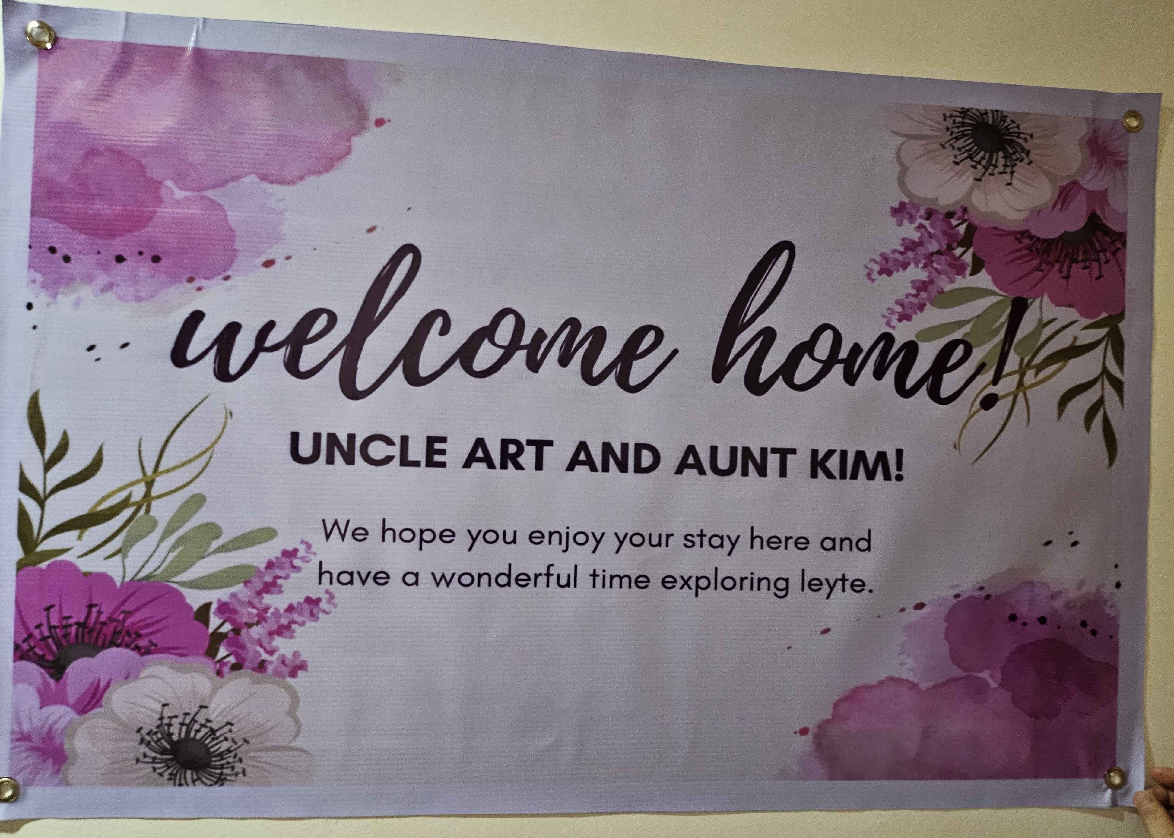 家の入るドアを開けると・・・娘のアーリン、レストランの従業員が「Welcome!」と花束を持って出迎えてくれ、壁にはなんと!Welcomeのサイン。噂には聞いているアンクルアートの嫁が来る!ということで、こんなバッサバサなオバサンが来るのを心待ちにしてくれていたそうだ。感謝!でも待てよ、ちょっと前には火事騒ぎが・・・それなのにみんな普通・・・っていうよりか、もう笑顔で私達を迎えてくれている。